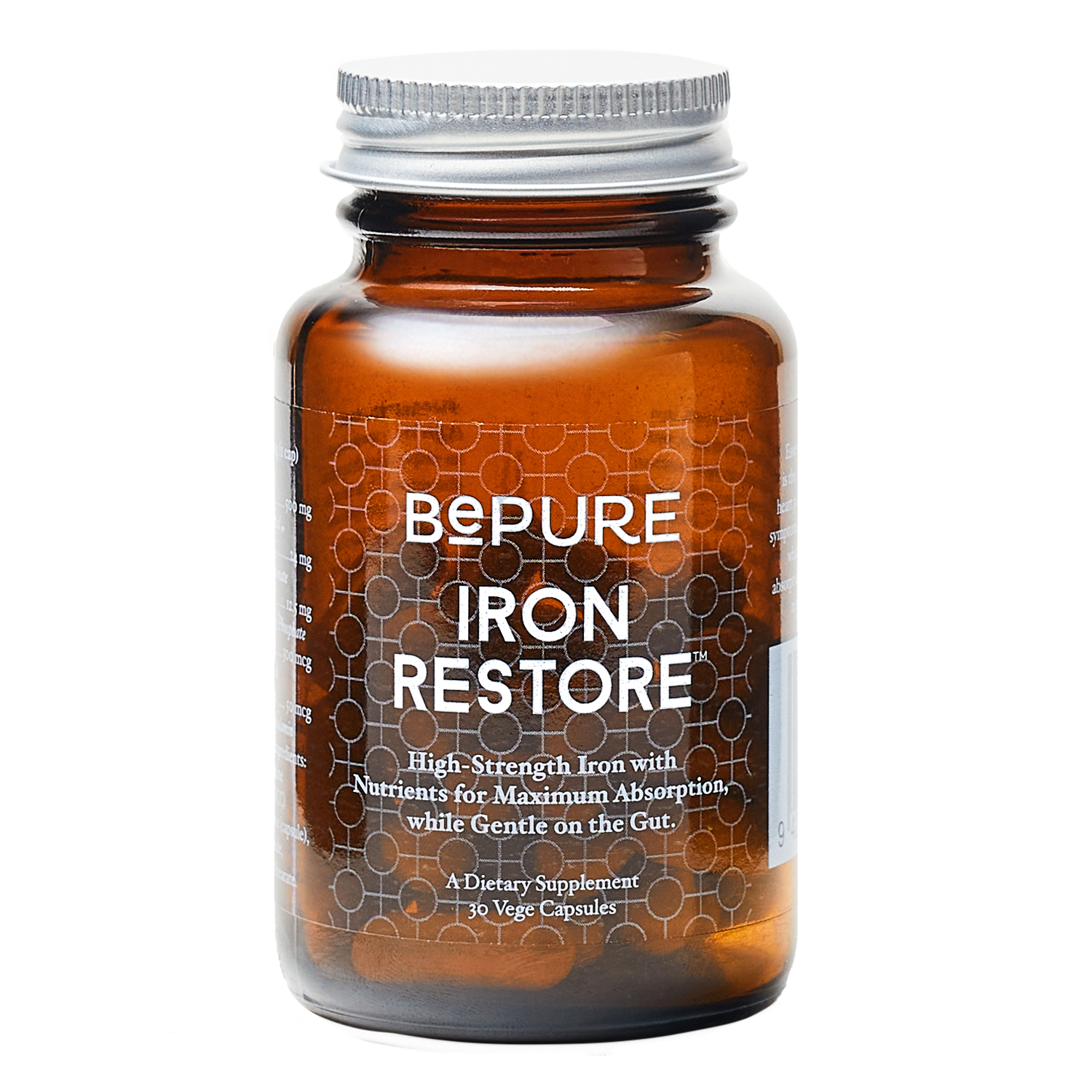 BePure Iron Restore provides 24 mg of highly bioavailable iron in a gut-friendly biglycinate form, 500 mg of vitamin C is provided per serving to assist with the absorption of iron. BePure Iron Restore also provides essential blood building cofactors of B9, B12 and B6 to further support the production of hemoglobin.